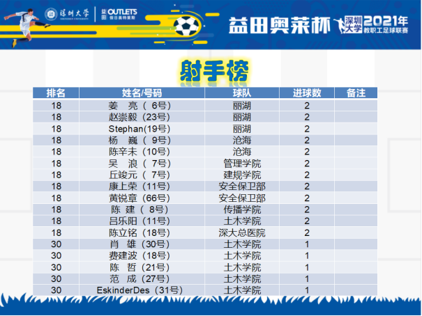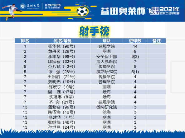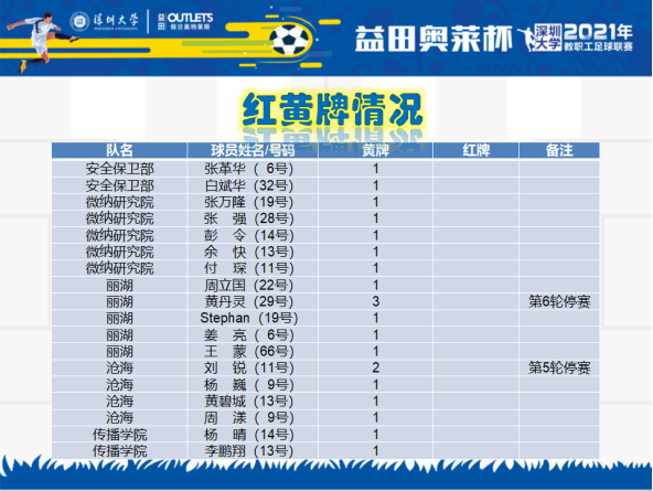 9月26日,“益田奥莱杯”深圳大学2021年教职工足球联赛进行了第九轮的四场比赛,本轮比赛传播学院队轮空,四场比赛对决结果如下: