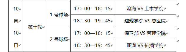 第十轮开始,比赛时间统一调整为周日的17:00开始,望各队悉知。同时也欢迎广大师生现场观战,助威加油!