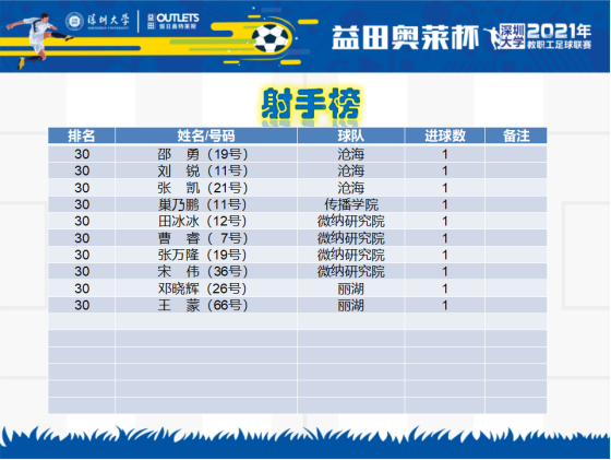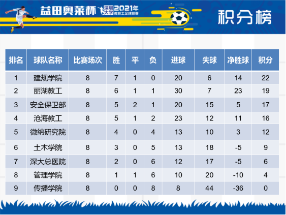 本轮比赛过后,联赛赛程已过半。回顾上半程比赛:建规学院一枝独秀,8场比赛7胜1负,积22分,以不败战绩高居榜首;丽湖教工8场比赛6胜1平1负,积19分,以3分的差距位居次席;本届联赛的黑马安全保卫部则依然保持着黑马本色,8场比赛5胜2平1负,成功位列三甲。沧海教工、微纳研究院、土木学院、深大总医院、管理学院、传播学院依次位于4-9位。