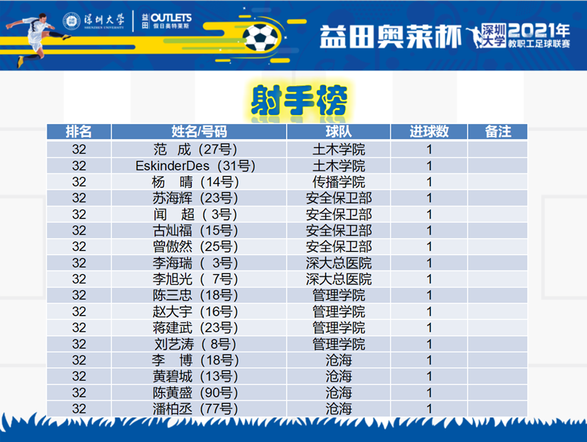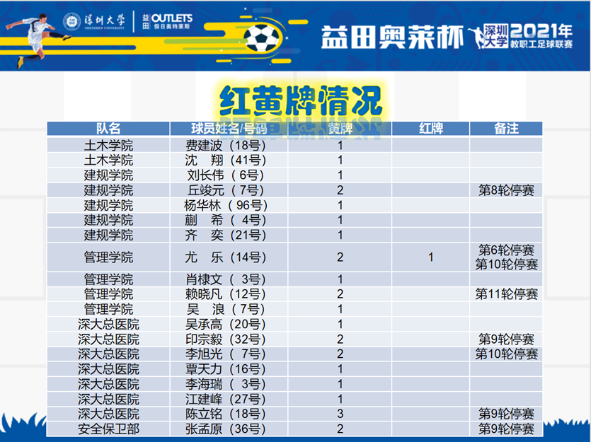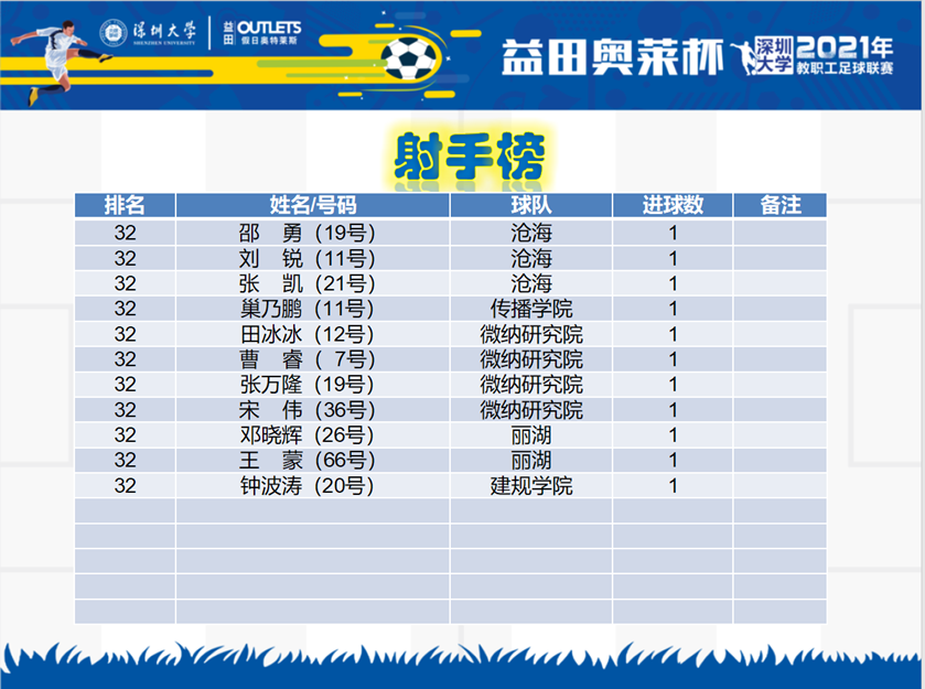 10月10日,“益田奥莱杯”深圳大学2021年教职工足球联赛进行了第十轮的四场比赛,本轮比赛微纳研究院轮空,四场比赛对决结果如下: