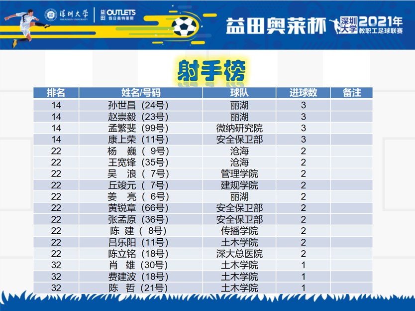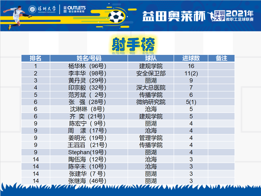 本轮比赛榜首第一集团的四支球队都取得了胜利,积分榜上建规学院依然领跑,丽湖教工、安全保卫部、沧海教工紧随其后。排在榜尾的四支球队本轮虽然没有能赢的比赛,但球队却展现出良好的状态,他们给对手都制造了不小的麻烦,相信随着联赛的进行,他们会越踢越好。下面是本轮过后的积分榜情况: