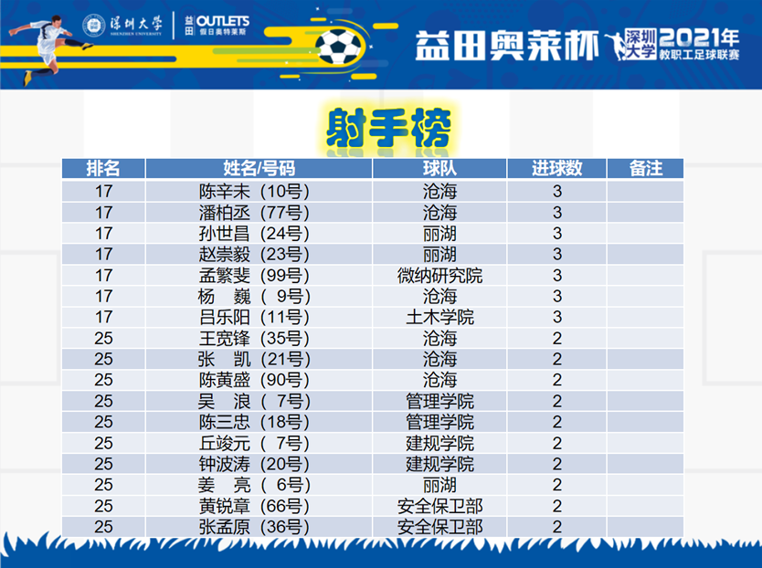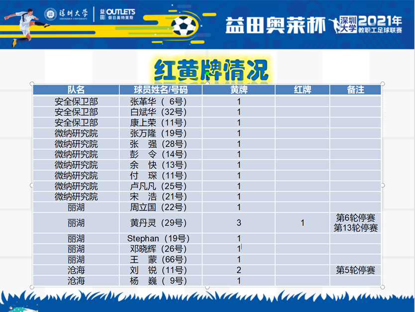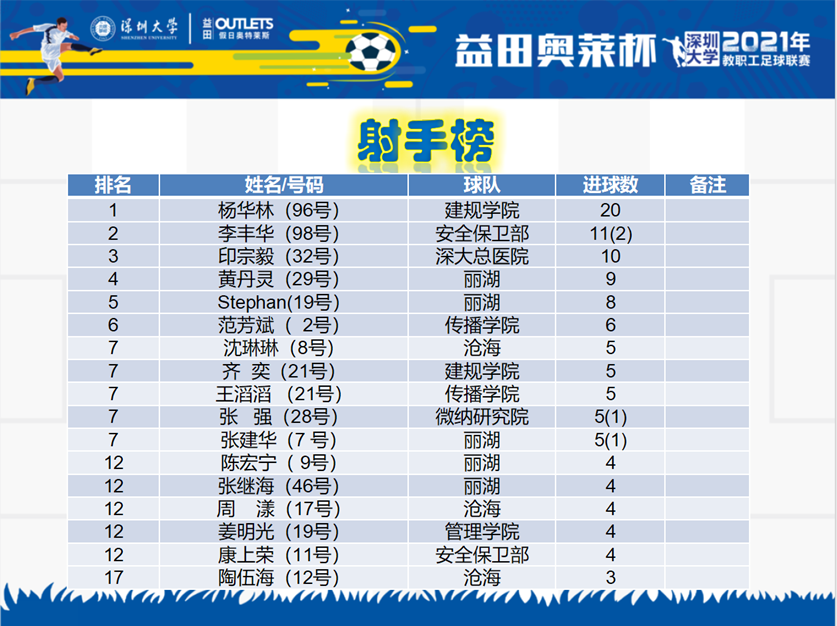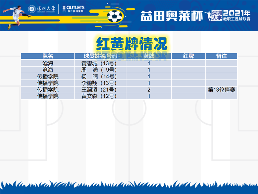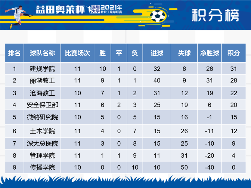 10月24日,“益田奥莱杯”深圳大学2021年教职工足球联赛进行了第十二轮的四场比赛,沧海教工队本轮比赛轮空,四场比赛对决结果如下: