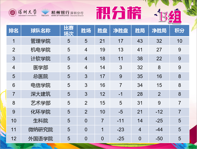 B组比赛,榜首球队管理学院、计算机与软件学院此轮上演强强对决,比赛也是精彩场面不断,最终管理学院依靠男队的优势4:1战胜计算机与软件学院,5战全胜高居B组榜首。医学部对战生科院的比赛同样精彩激烈,比赛一直到最后的男单决胜盘才分出胜负,医学部3:2险胜生科院。化环学院与总医院的比赛同样打到了第五盘,最终化环3:2险胜总医院。深大建筑对阵艺术学部,五盘大战再次上演,最终深大建筑3:2险胜艺术学部。其余两场比赛,外国语和微纳研究院弃权比赛,电信学院和机电学院不战而胜,全取2分。B组比赛情况: