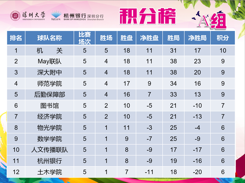 下面是本轮比赛的赛况报道:A组,领头羊机关队此轮对阵图书馆,由于主力队员伤病,经过五盘大战,3:2艰难战胜了图书馆队,五轮比赛保持全胜,继续占据A组积分榜首位。深大附中此轮对阵物光学院,双方实力相当,同样经过五盘大战,深大附中3:2险胜。师范学院同经济学院的比赛同样激烈,最终师范学院在前四盘3:1奠定了胜局,虽然最后单打失利,但仍以总比分3:2获得了胜利。其他比赛后勤保障部4:1战胜了数学与统计学院。MAY联队5:0轻取土木学院。杭州银行3:2战胜了人文传播联队,取得联赛首胜。A组比赛情况: