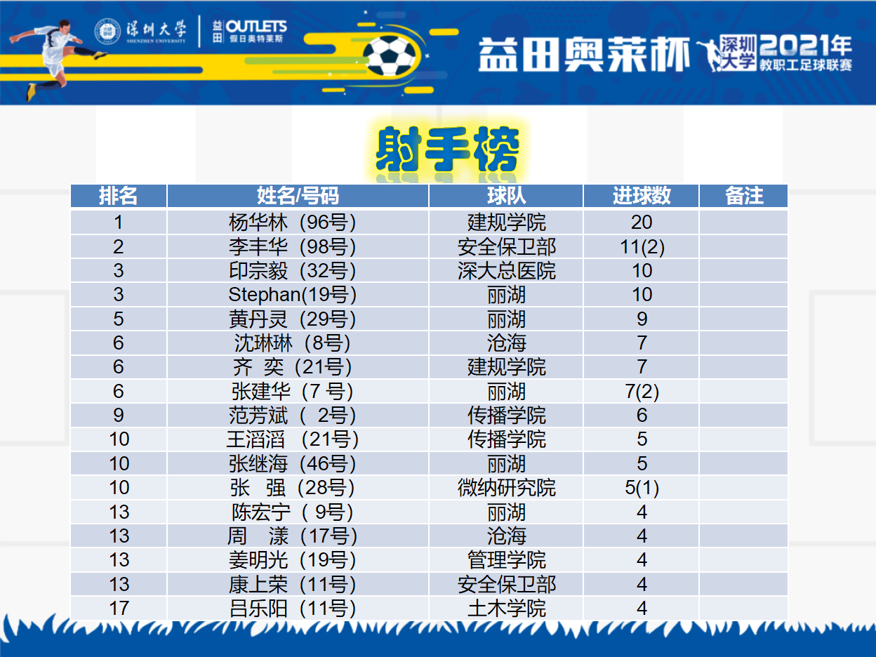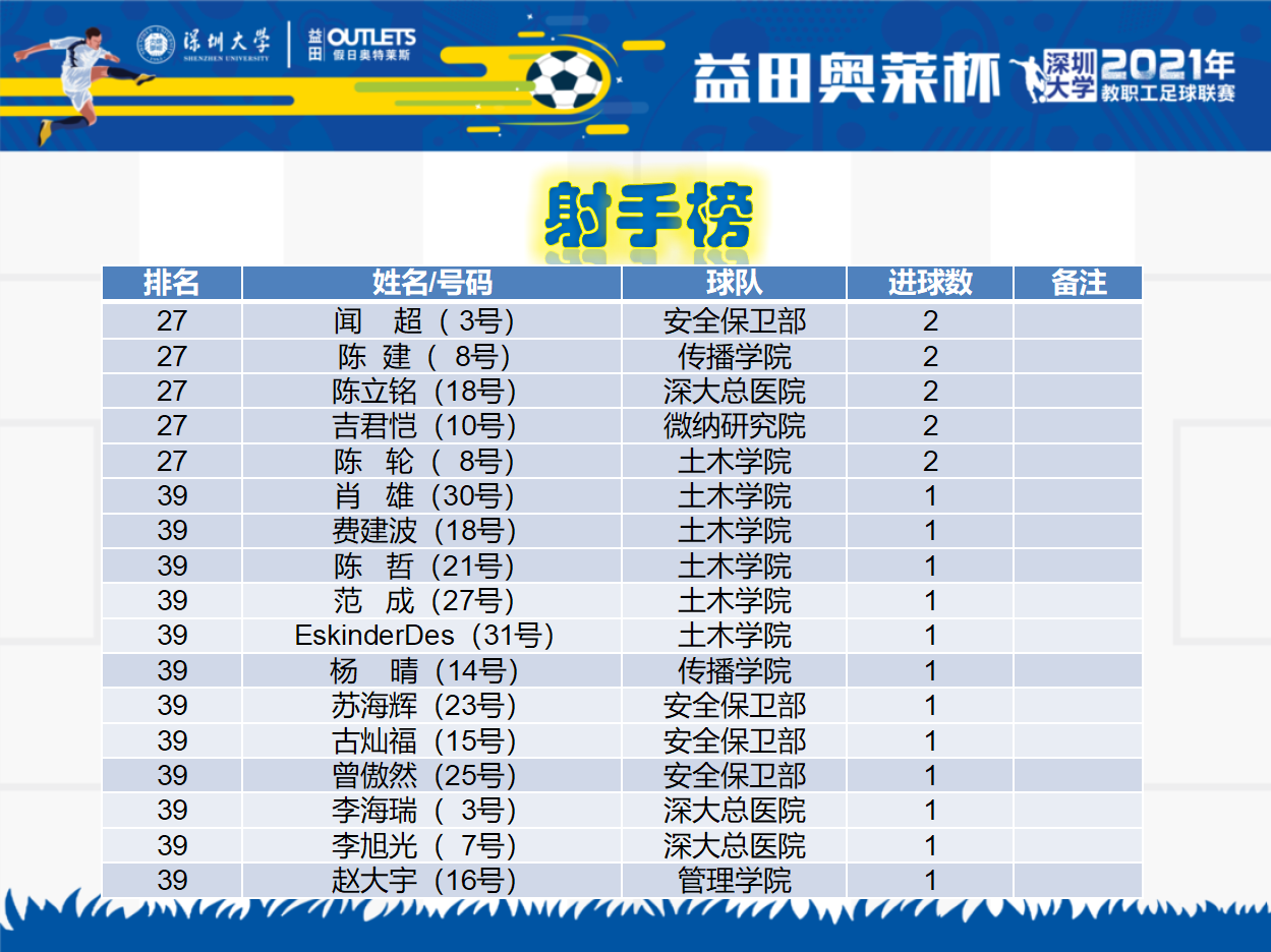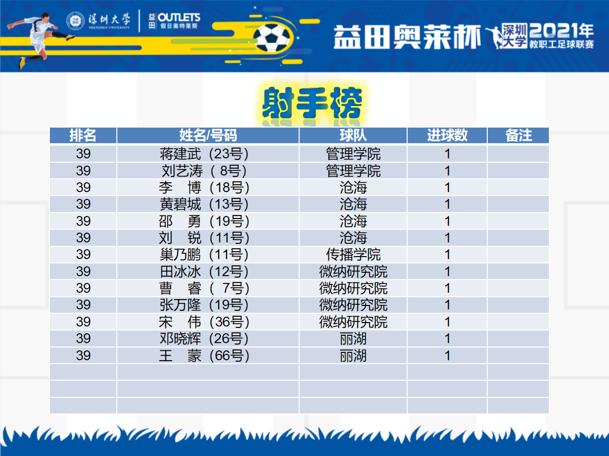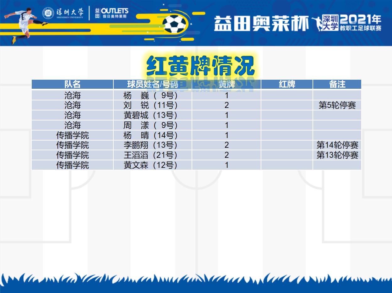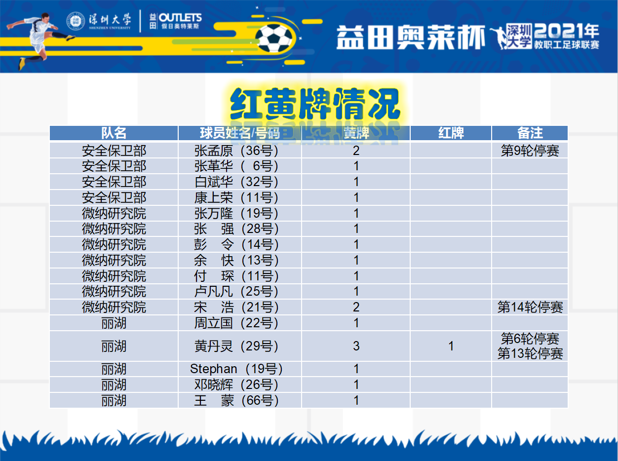 10月31日,“益田奥莱杯”深圳大学2021年教职工足球联赛进行了第十三轮的四场比赛,深大总医院本轮比赛轮空,四场比赛对决结果如下: