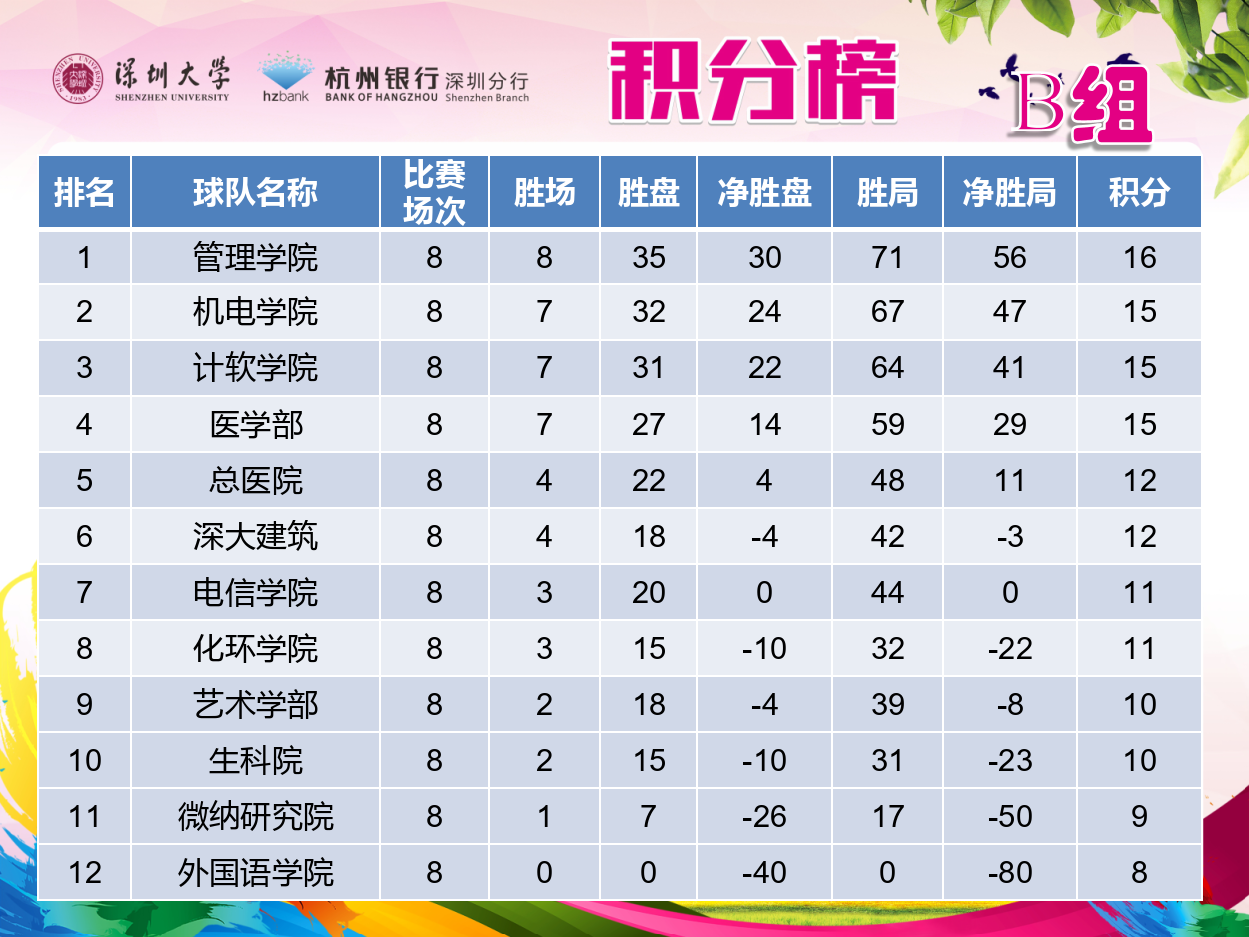 下面是本轮比赛的赛况报道:A组,排名前两位的深大附中和机关队此轮都战胜各自对手,继续处在积分榜的前两位。此前A组排名第三的师范学院此轮与排名第四的MAY联队本轮遭遇,也成为A组此轮的焦点之战,MAY联队显然准备的更加充分,前三盘连下三城,虽然师范学院在此后的男双比赛中扳回一盘,但已无力回天,最终MAY联队4:1获得胜利,同时也代替师范学院升到积分榜的第三位,师范学院排名第四。其他几场比赛,数学与统计学院4:1战胜图书馆。物光学院2:3不敌经济学院。土木学院3:2战胜杭州银行。