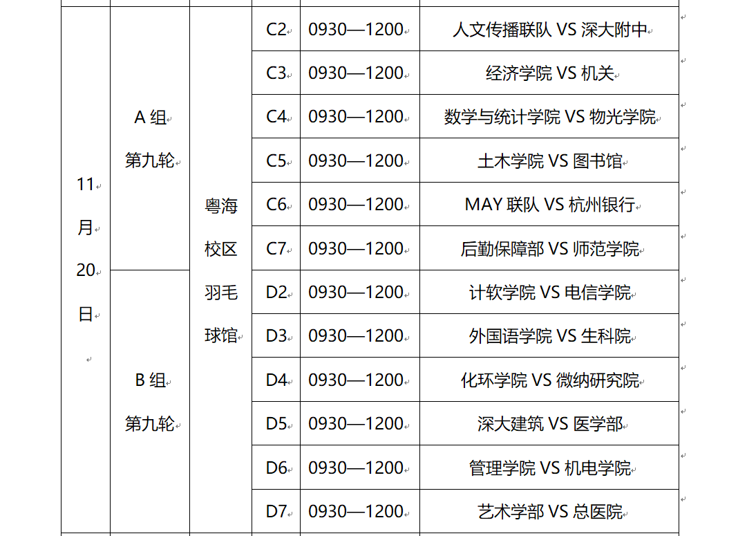 第九轮比赛将在11月20日在粤海校区羽毛球馆进行,具体对阵、场地和时间安排情况如下: