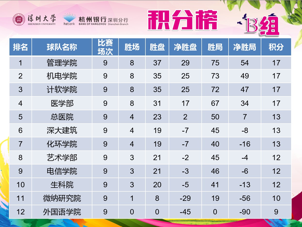 医学部 4:1 深大建筑 生科院 5:0 外国语学院(弃权) 计软学院 4:1 电信学院