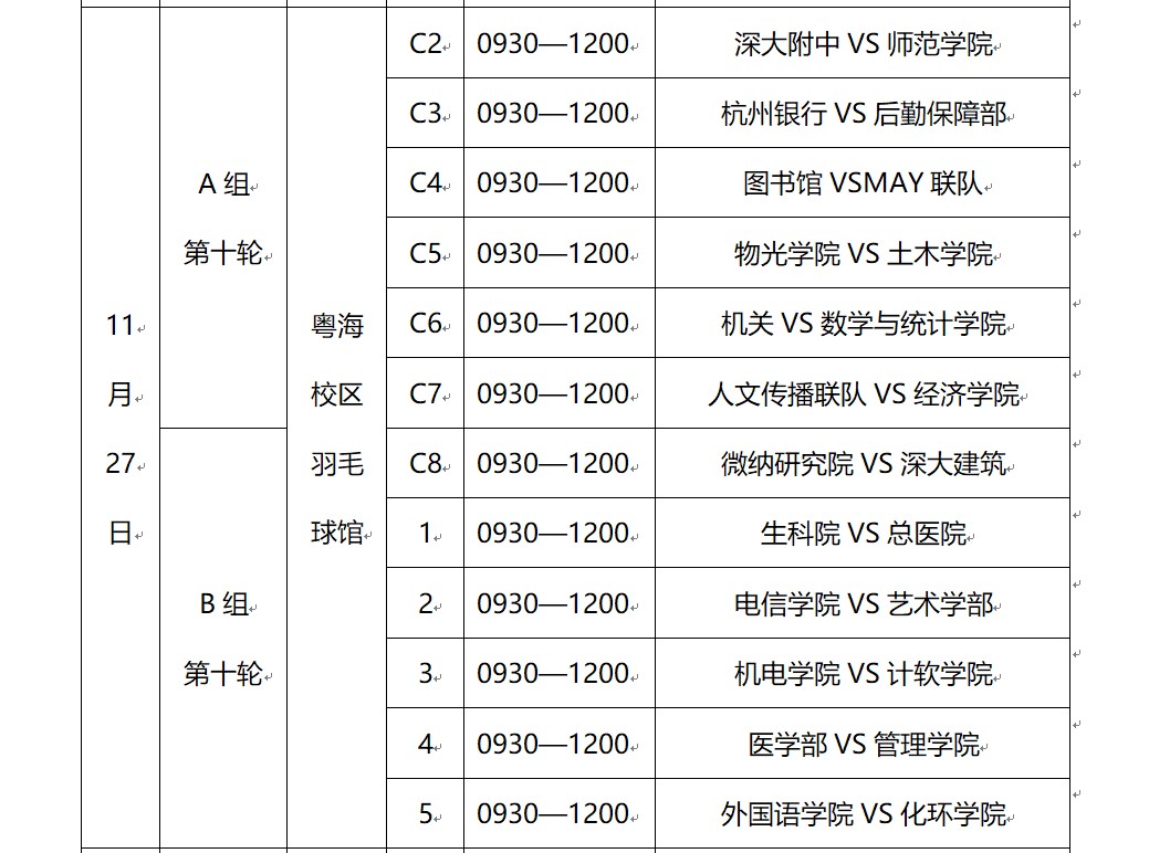 第十轮比赛将在11月27日在粤海校区羽毛球馆进行,具体对阵、场地和时间安排情况如下: