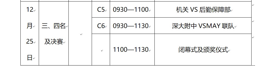 最终决赛将在12月25日在粤海校区羽毛球馆进行“圣诞大战”,比赛场地和时间安排如下: