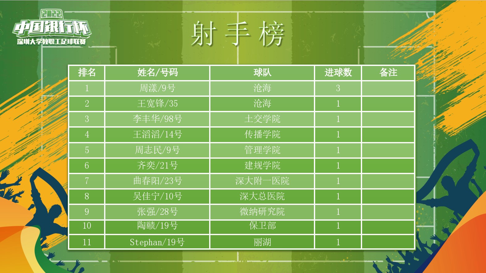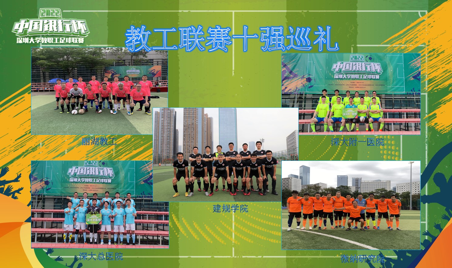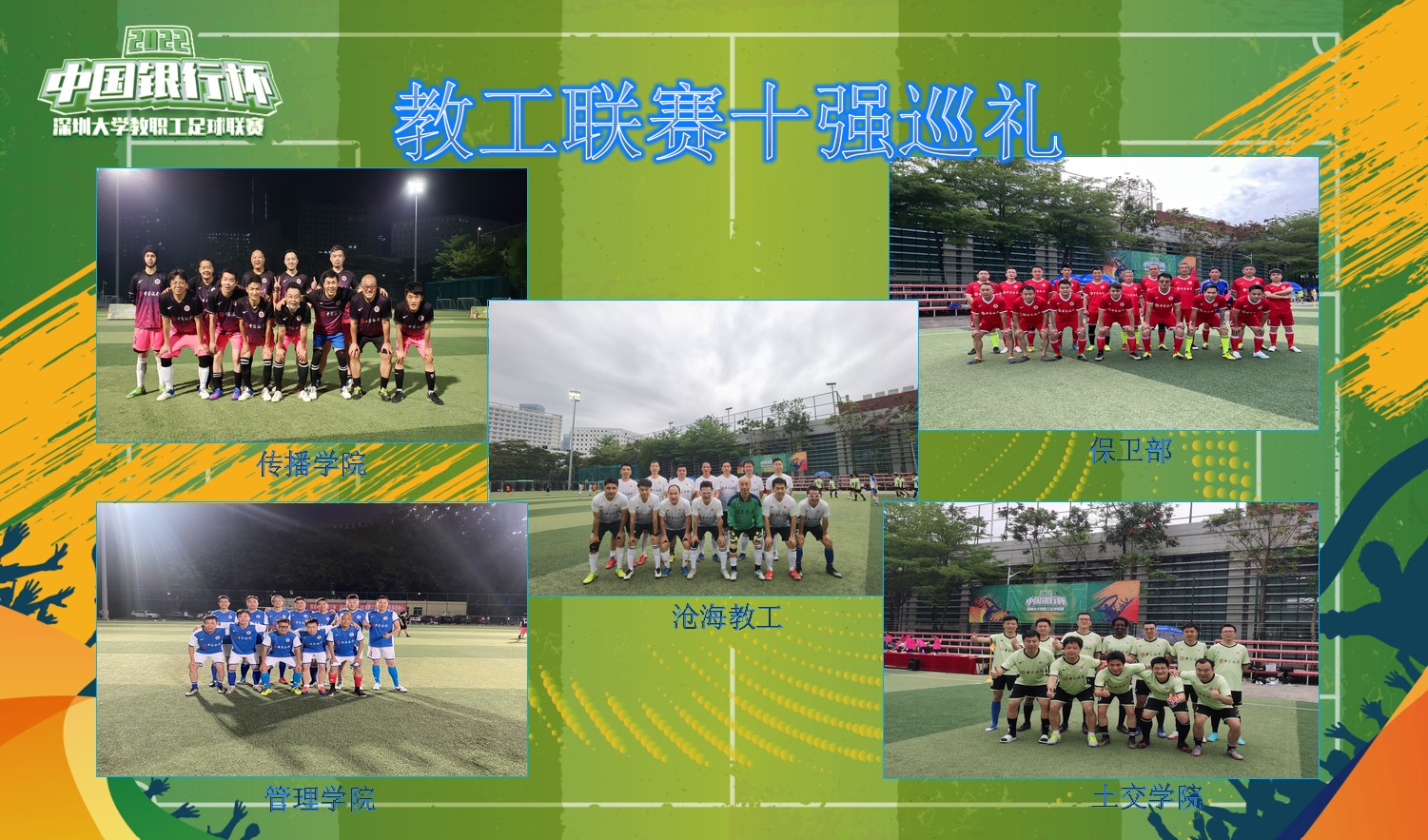 一年一度的教职工足球联赛,自2019年创立以来,已经成为广大教职工最喜闻乐见的一项赛事,其新颖灵活的赛制,全面及时的赛事报导,吸引了越来越多的教职工参与到赛事中来。今年的比赛,在中国银行深圳市分行的大力支持下,参赛队伍达到了10支,参赛队员覆盖了全校20多个学院和部门,人数也突破了200人,其规模和影响力再创新高。