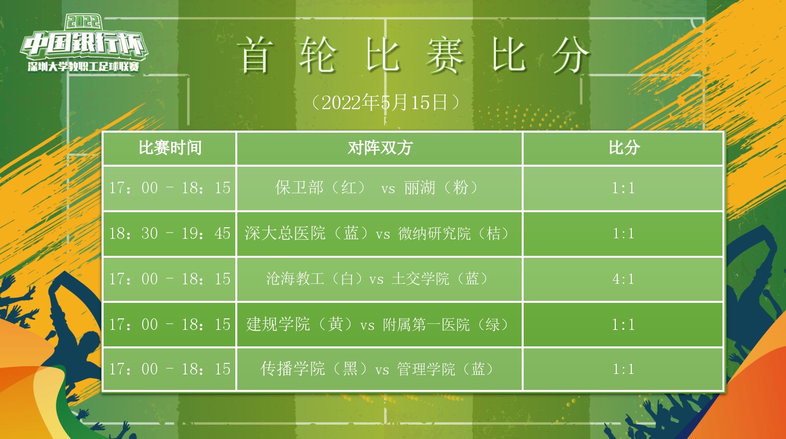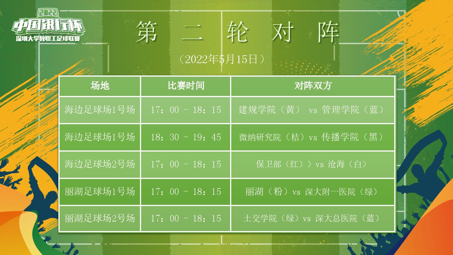 “疫去春来,满园花香,中行助力,激情再燃!”,备受广大教职工瞩目的“中国银行杯”深圳大学2022年教职工足球联赛,上周日(5月8日),在粤海校区海边足球场进行了开幕式和首轮的五场比赛。
