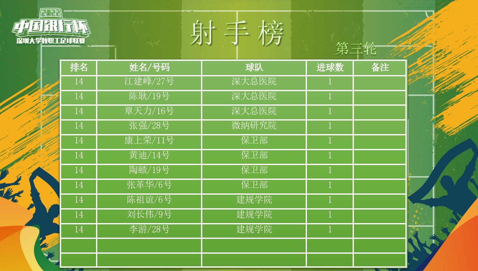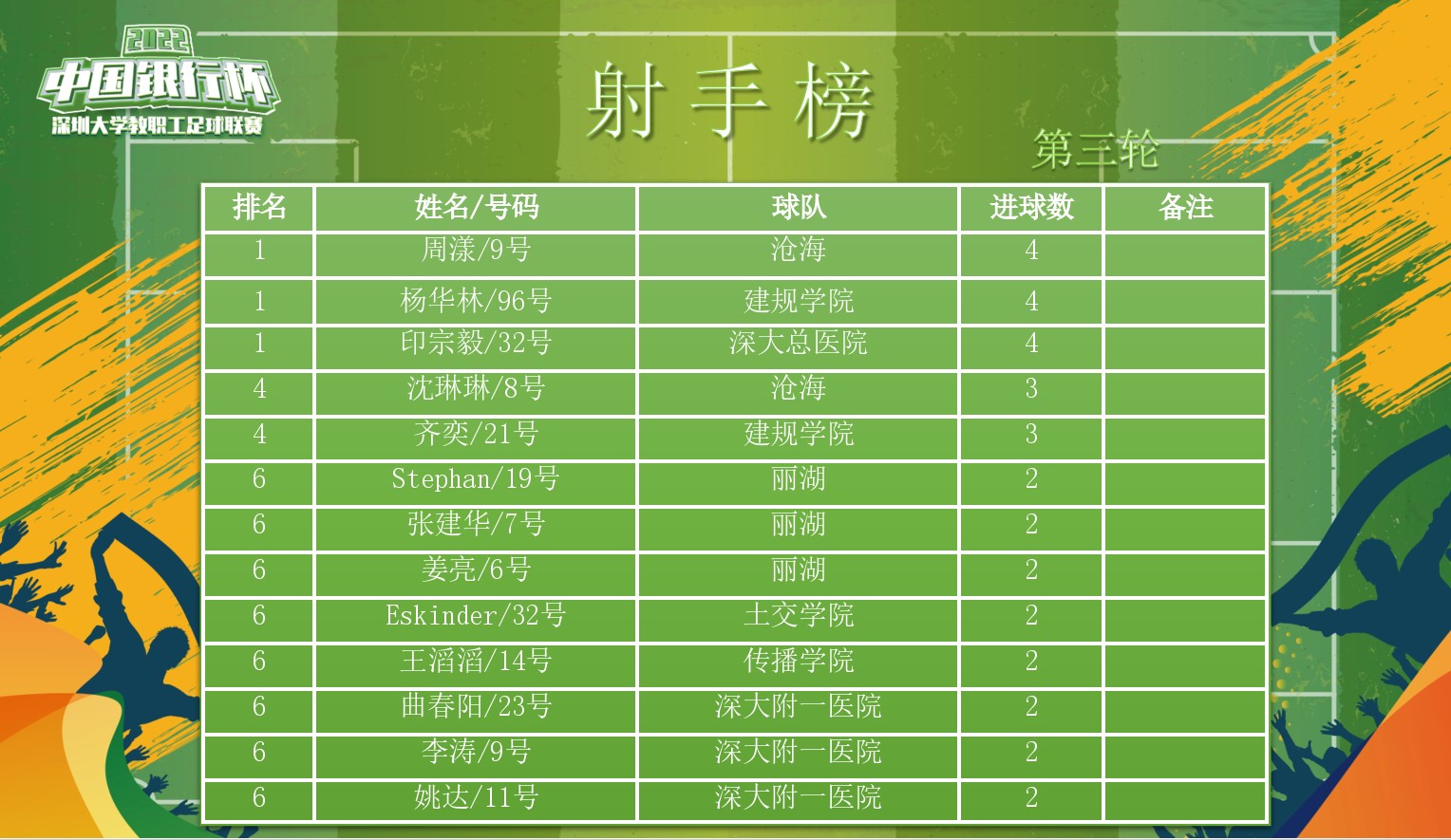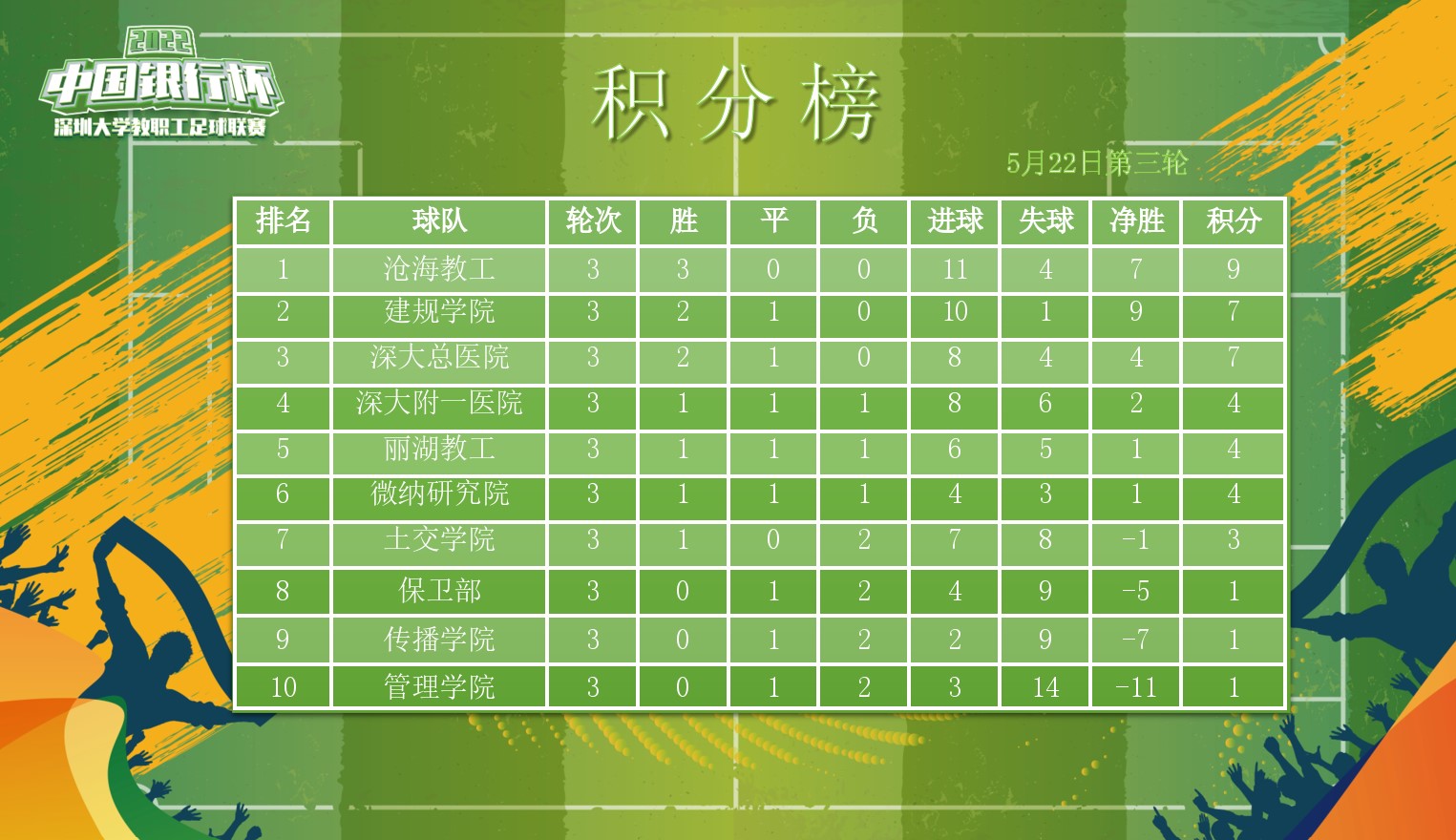 粤海校区本轮共进行三场比赛:周六提前进行的是卫冕冠军建规学院和“青年军”微纳研究院的比赛。上场取得大胜的卫冕冠军此战肯定是志在3分,而“青年军”微纳研究院队伍年轻,朝气蓬勃,此次联赛又有新鲜血液加入,联赛开赛以来,一平一胜,也有着不俗的实力。双方一开场,微纳研究院摆出了稳守反击的阵容,卫冕冠军也毫不客气,一上来就大刀阔斧,强势进攻,并在开场哨刚刚吹响不久,就率先取得进球,失球的微纳研究院也逐渐找到进攻节奏,几次反击也险些破门,上半场建规学院1:0领先。下半场,微纳研究院更换了几名球员,也先后几次威胁到对方球门,但终因投入的进攻兵力不够,无法打开局面,而经验老到的建规学院抓住一次任意球机会,利用守门员视线被挡,吊射得手,2:0奠定胜局。周日进行的两场比赛,一场是备受关注的沧海教工对阵丽湖教工的两大校区之间的对决,丽湖教工上场强势逆转深大附一医院,全队状态正佳,本轮更是全主力出战,而沧海教工开赛以来,已取得两连胜,是唯一全取6分的球队,两队此轮相遇,必将上演一场惊天对决。一开场,沧海队仍然打起了熟悉的传控战术,丽湖则回缩防守,意图利用锋线的速度伺机反击。沧海队明显进入比赛状态更快一些,在几次进攻威胁到对方球门之后,由前锋球员抓住机会,打出一脚漂亮的“落叶球”世界波,在上半场1:0取得领先。下半场易边再战,逐渐掌握比赛节奏的沧海队,利用两次后卫插上助攻,再入两球,3:0大比分领先。领先后的沧海队,有所放松,被丽湖队抓住机会,利用两次任意球机会,强势扳回两球,但无奈比赛时间已经不多,最后只能2:3遗憾落败。沧海队取得三连胜,继续领跑积分榜。另一场比赛,已连败两场的土交学院对阵传播学院,正所谓哀兵必胜,前两场状态不佳的土交学院,此战可谓火力全开,自己攻入对方4球的同时,还收获对方的乌龙大礼,传播学院下半场也攻入1球,但已无奈对方状态的神勇,土交学院5:1,获得赛季首胜。