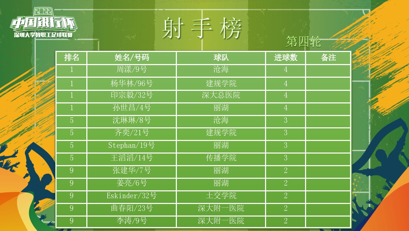 丽湖校区本轮也进行了两场比赛,坐阵“主场”取得两连胜的深大总医院,将迎来前三轮取得全胜的榜首球队沧海教工队的挑战。上半场,明显不在状态的沧海队,进攻中失误较多,处理球也略显急躁,反观总医院却利用锋线的速度优势频频撕扯对方防线,威胁对方球门,好在沧海稳固的后防线顶住压力,多次化解对方进攻,上半场双方0:0互交白卷。下半场,沧海队通过换人调整,逐渐找回进攻节奏,开场不久,好运也降临到沧海队头上,总医院禁区内球员手球,沧海获得点球,35号操刀命中,1:0取得领先,并将优势保持到终场,沧海艰难获胜,取得四连胜,继续领跑积分榜。同时进行的另一场比赛,丽湖教工对阵管理学院,丽湖一开场就气势如虹,上半场结束,已经连下四城,取得4:0的大比分领先,下半场虽然攻势有所减弱,仍然再入一球,值得一提的是丽湖队的4号球员,本场更是上演了“大四喜”,并在射手榜上与其他3位球员并列首位。